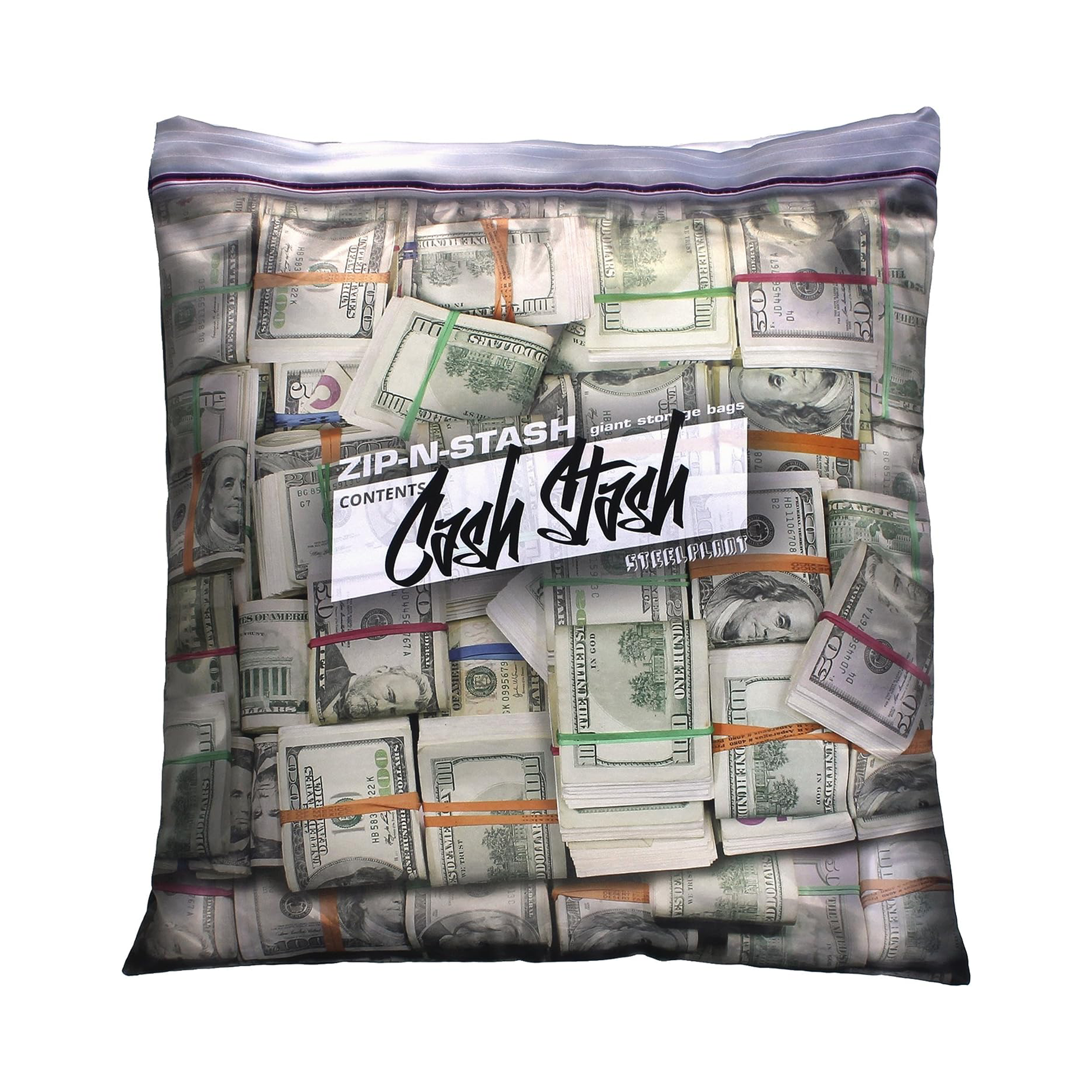 Get that bag with a simulated sack of banded unmarked bills. The Giant Stash pillowcase is a great way to goof, ball on a budget, or shower family member on their birthday. Pillowcase has a zipper top, internal pocket, and black interior lining.
